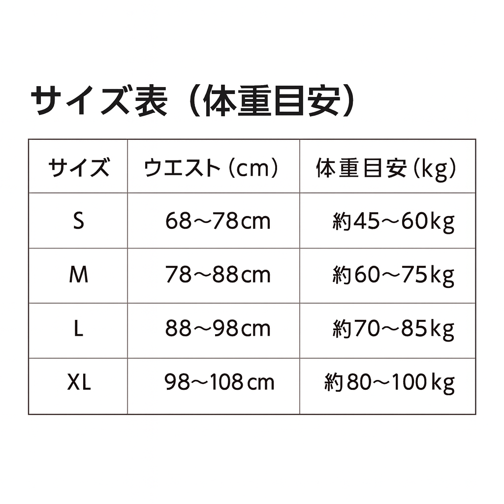 ウエストサイズに合わせて、S〜XLまでご用意しております。